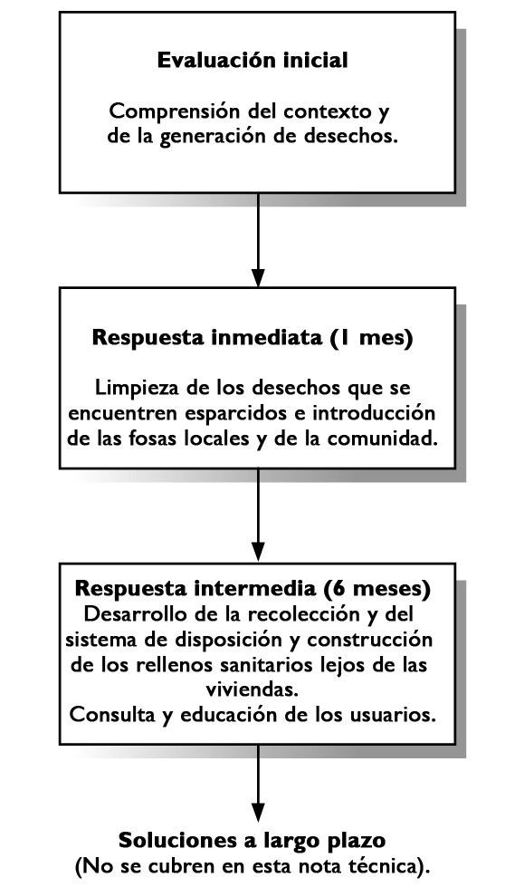 Las actividades se deben priorizar de acuerdo con los peligros para la salud, actuales y futuros, que presentan los diferentes tipos y fuentes de desechos. Es probable que las actividades se enfoquen en retirar los desechos dispersos y manejar los desechos de los hogares y de los mercados.