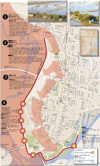 La avenida Circunvalación, más concretamente la defensa inconclusa a la altura del Hipódromo, tendría un rol protagónico en la catástrofe. El futuro se presentaba muy complejo ya que los pronósticos meteorológicos para el trimestre marzo-mayo auguraban lluvias y temperaturas por encima de las normales. (Ver Esquema de ingreso de aguas en Cap.1)