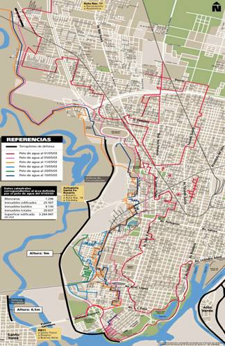 Acercándonos a la ciudad desde el oeste nos encontramos con el río Salado, separado de gran parte de su valle de inundación por una extensa defensa (norte-sur) con un coronamiento de 9 m (~17,45 IGM). Inmediatamente después la avenida de Circunvalación y posteriormente asentamientos urbanos en terrenos con una cota baja, la cual aumenta lentamente a medida que avanzamos, y con ella los barrios son cada vez más consolidados y “formales”, hasta llegar a avenidas importante de la ciudad como Freyre, López y Planes, Blas Parera, que actuaron en general como “dique este”. Por la falta de cierre, la defensa presentaba una interrupción abrupta en el norte (Hipódromo) formando una discontinuidad de 500 m de longitud y con una diferencia de varios metros de altura respecto a la defensa (4-5m) hasta encontrarse con terrenos más altos. La “brecha” debía cerrarse con el tramo III de la defensa, pero se registran antecedentes de cierres provisorios como ocurrió durante la creciente de 1998 (ver Cap. 1). Además, aguas abajo de la brecha, en forma perpendicular a la defensa del lado del río, los taludes de la autopista Rosario-Santa Fe, con un puente sobre el lecho principal con una luz de solo 150 m sobre un ancho del valle de 2000 m, formaban un verdadero dique de contención para las aguas.