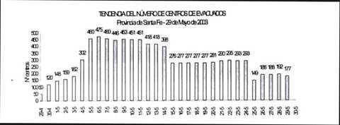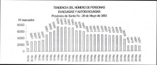 En los Gráficos 2.1 y 2.2 se puede observar la evolución del número de evacuados y de centros de evacuados en base a la información oficial de la Secretaria de Estado de Promoción Comunitaria de Santa Fe. El pico se encuentra el día 07 de mayo con 75036 evacuados en 460 centros de evacuación.
