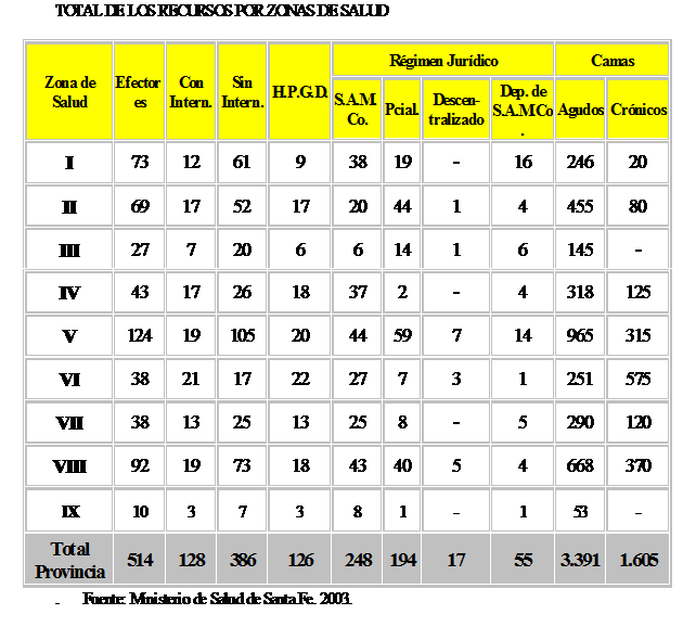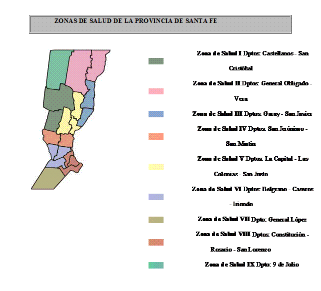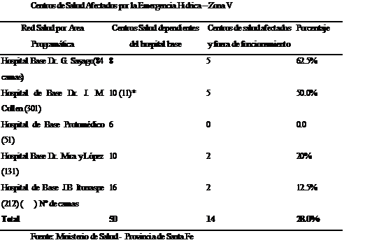 La Provincia de Santa Fe tiene organizado el sector de salud pública en 9 zonas sanitarias. El sistema de salud pública de la Provincia de Santa Fe tiene una organización descentralizada, con nueve zonas sanitarias que tienen su propia infraestructura de salud y recursos para desarrollar acciones de atención de la enfermedad y de prevención. Cubre aproximadamente el 65% del total de las consultas externas de la provincia. El 35% restante lo realizan los efectores privados y de la seguridad social. Entre 1992 y 2002 aumentaron un 86,1% las consultas externas, un 44,7% los egresos y los partos hospitalarios dado el aumento de la desocupación y el consecuente menor aporte económico a la seguridad social, sumado al más del 40% de población que no tiene ninguna cobertura de salud. La zona V (La Capital, Las Colonias, San Justo) tiene una población asignada de aproximadamente 630.000 habitantes y fue la más afectada por las inundaciones. Los Hospitales J.B.Iturraspe y el Dr. Sayago en menor medida, de sus cinco hospitales base, fueron afectados directamente por inundación en su subsuelo, recuperando con rapidez su pleno funcionamiento.