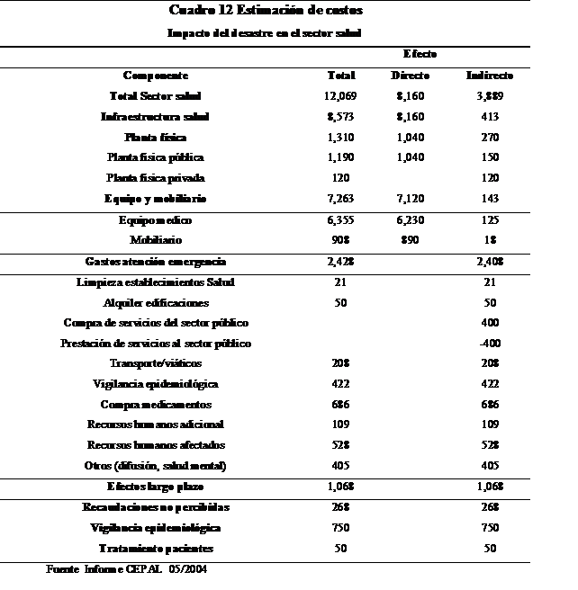 Como una forma de estimar aproximadamente el impacto económico del desastre en área de salud tomamos el informe de CEPAL elaborado al efecto. Los costos están en pesos con un costo total de 12,069 millones de pesos.